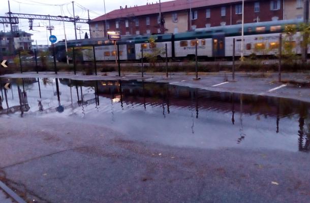 Una pozza d’acqua porta via i posti auto in stazione
